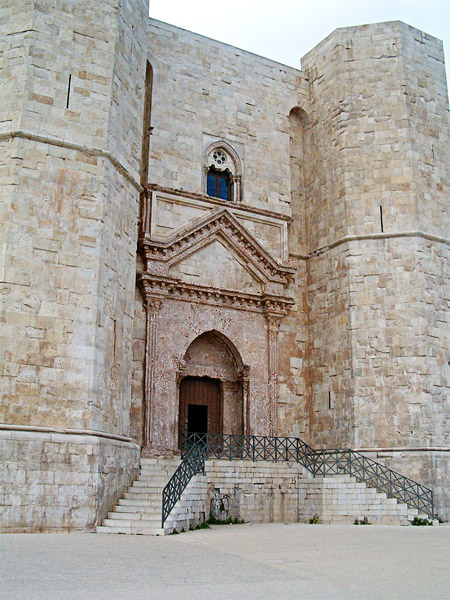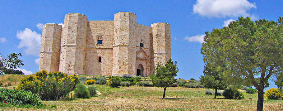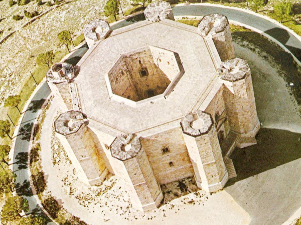Castel del Monte è un edificio fatto costruire intorno al 1240 dall'imperatore Federico II in Puglia, con una caratteristica forma ottagonale con una torretta per ogni spigolo. Nel 1223, infatti, la capitale del regno delle due Sicilie fu traferita da Palermo a Foggia, luogo più strategico; perciò era necessario costruire nuovi avamposti e residenze. Incerta è l'attribuzione a un preciso architetto: molti sostengono che a ideare la costruzione fu lo stesso Federico II. Il cortile, così come tutto l’edificio, è caratterizzato dal contrasto cromatico prodotto dall’uso di breccia corallina, pietra calcarea e marmi. Castel del Monte non fu solo una fortezza difensiva, ma, considerando l’attenzione data agli interni, è stato di sicuro anche una residenza reale. Con Carlo I d’Angiò divenne ancor più una fortezza e un carcere; funzione che continuò ad avere quasi sempre. A partire dal XVIII secolo seguì un lungo periodo d'abbandono, durante il quale il castello venne spogliato di arredi e decorazioni parietali e divenne un ricovero per pastori, briganti e profughi politici. Nel 1876 prima della rovina definitiva, Castel del Monte venne acquistato dallo Stato Italiano che fece iniziare i lavori di restauro; nel 1996 l’UNESCO ha inserito nella lista dei luoghi protetti il Castello di Federico II.