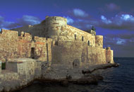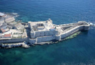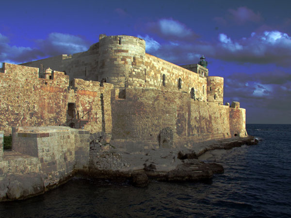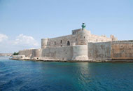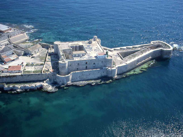 Il Castello Maniace particolare gioiello dell'architettura militare sveva, prende il nome dal generale bizantino Maniace che aveva occupato Siracusa nel 1038 liberandola dagli Arabi. Il castello è uno dei più importanti monumenti del periodo svevo a Siracusa e tra i più belli castelli federiciani. Esso sorge sulla punta estrema di Ortigia per controllare il porto e la città di Siracusa. L'impianto originario del castello Maniace è dovuto all'imperatore Federico II di Svevia, che lo fece erigere tra il 1232 e il 1239, seguendo le regole della razionalità e simmentria, dall'architetto Riccardo da Lentini, a pianta quadrata. Il castello aveva una doppia veste difensiva. Il castello è a pianta quadrata con lati di 58 metri, è impostato su un basamento a scarpa e agli angoli ospita quattro torri angolari cilindriche. All'interno vi sono i resti di unico e grandioso salone, la sala ipostila, che era completata da 25 eleganti crociere, di cui ne rimangono 10 facenti parte delle due navate superstiti. All'interno l'ambiente doveva apparire come un'unica sala scandita da 16 colonne libere, 4 semicolonne angolari e 16 semicolonne perimetrali, che sorreggevano 25 camopate, coperte da volte a crociera costolonate. Quattro monumentali segnavano gli angoli delle pareti. I capitelli della grande sala sono di tipo fogliato con terminazioni uncinate, i "crochets". Nella maggior parte riproducono le foglie di varie specie vegetali e rappresentano la parte più importante del capitello. Alcuni capitelli sono "figurati" con le particolarissime foglie di palma con datteri che si aprivano lasciando spazio a piccole e delicate sculture. Un bellissimo portale strombato a struttura ogivale, realizzato con preziosi marmi policromi di varia provenienza e una seria di collonnine marmoree e capitelli decorati a figure zoomorfe. Sopra l'arco domina lo stemma spagnolo, che fu posto nel 1614. Ai lati del portale vi sono le due nicchie, destinate a contenere, su mensole aggettanti, i due arieti di bronzo. Tutto il Castello è cinto da fortificazioni e per accedervi occorre attraversare un ponte di pietra fatto costruire da Carlo V nel XVI secolo. Il complesso attuale è l'unione di tre blocchi diversi: il castello svevo, il bastione della Vignazza e il cortile di collegamento con la città.