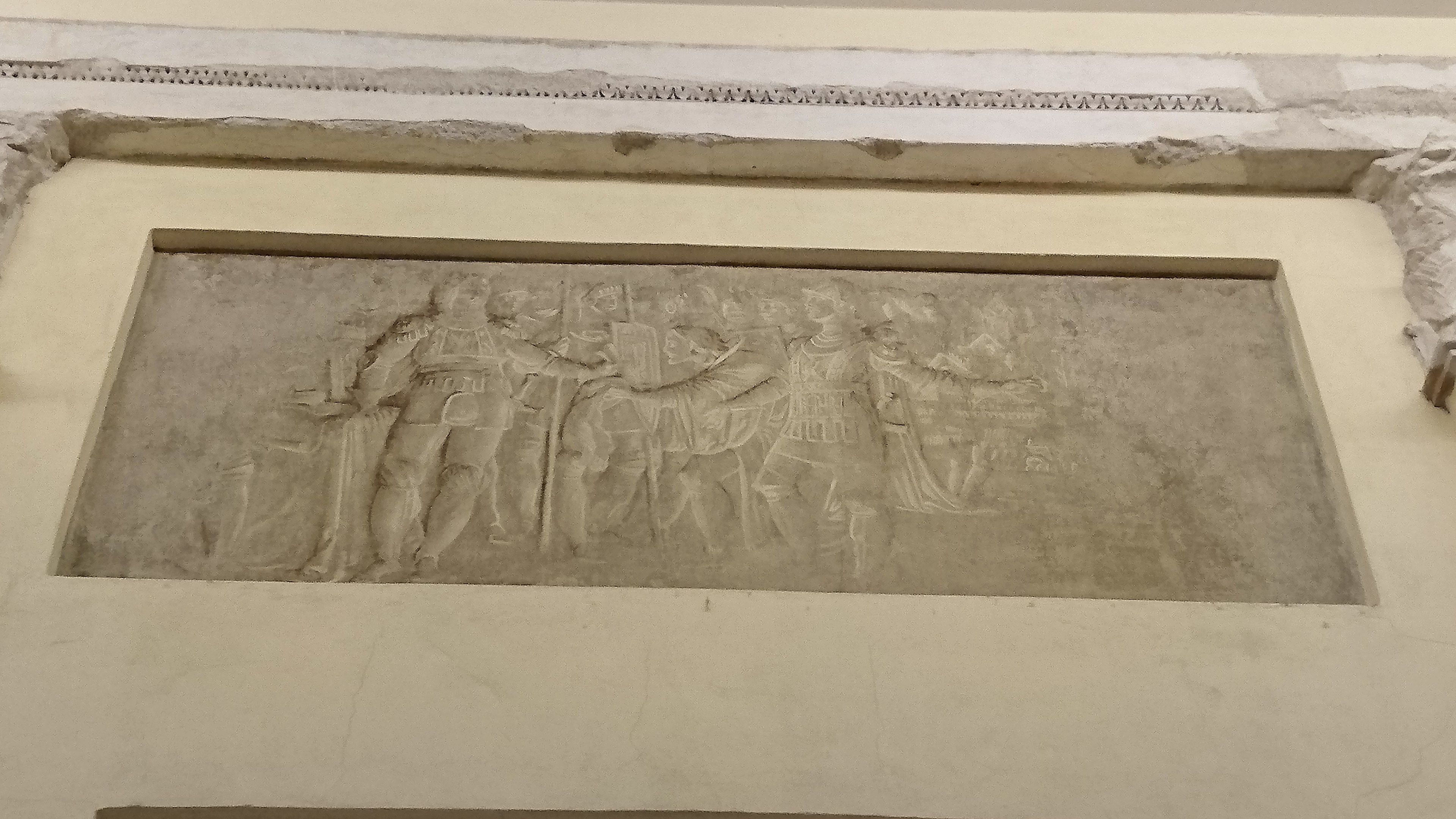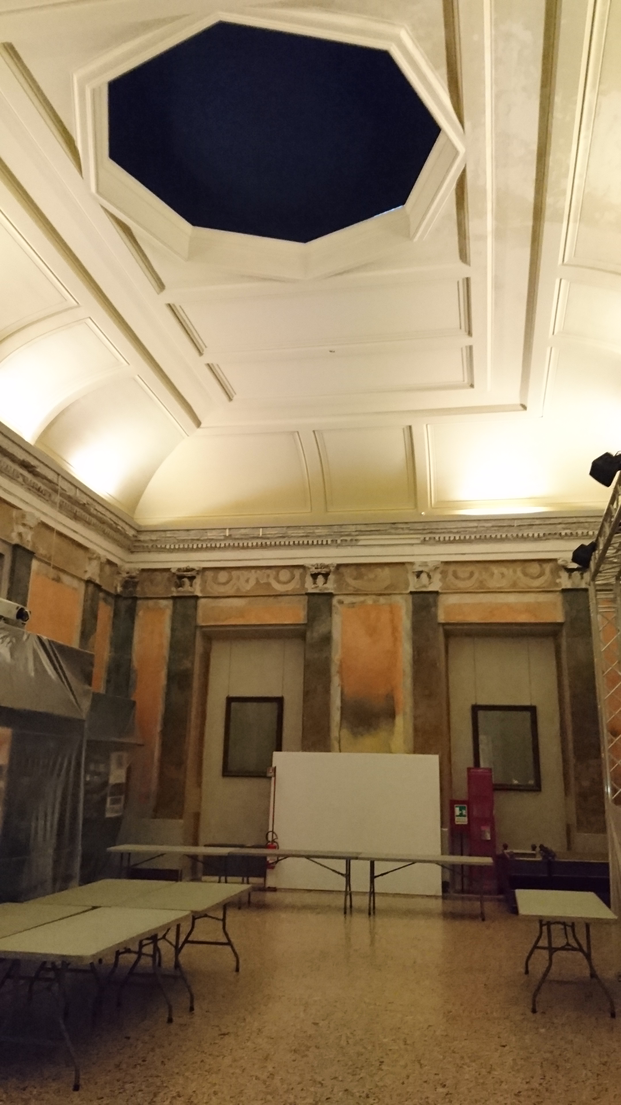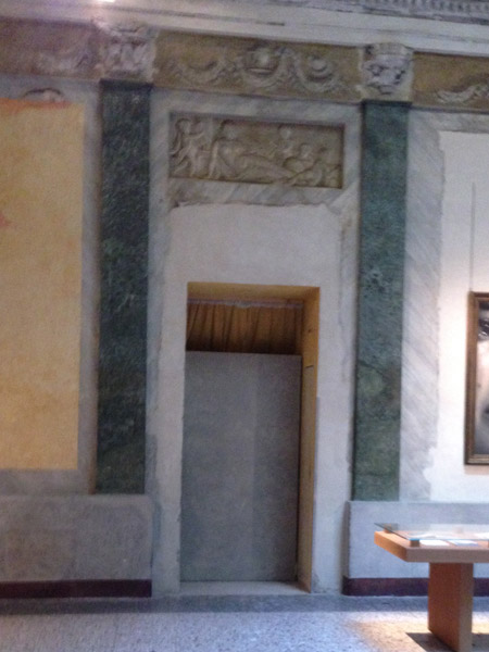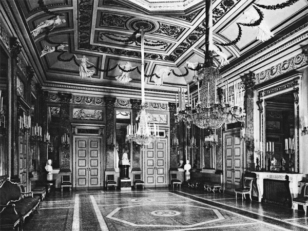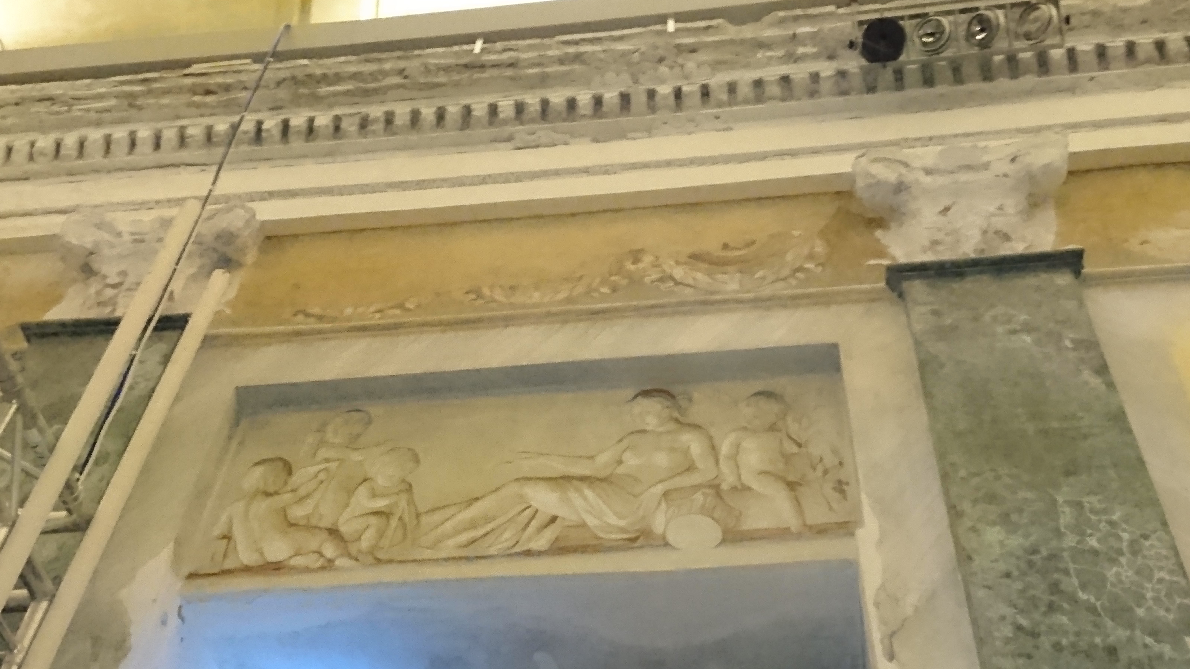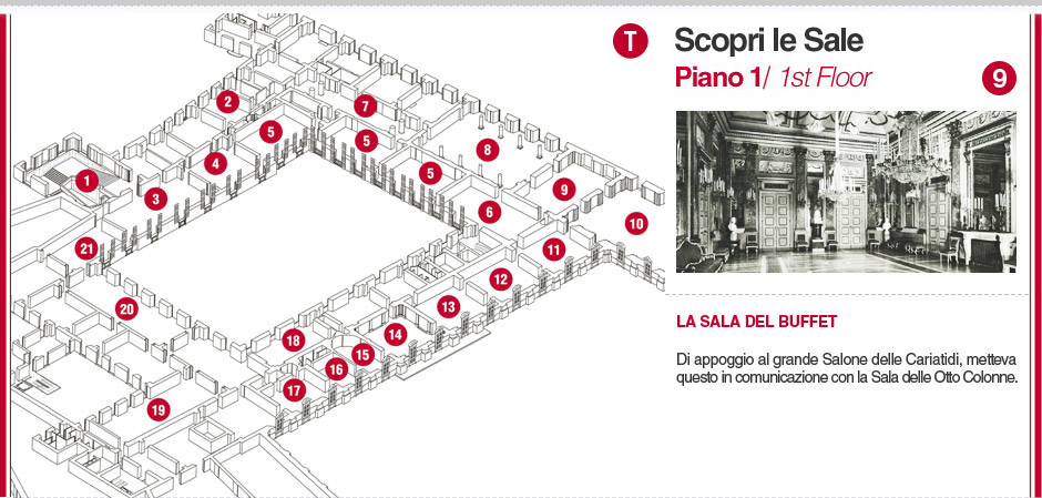 Moving backward from the Hall of Caryatids we enter the Buffet Hall: here two large crystal drops chandeliers hung from the ceiling, that was opened by a small octagonal skylight. On the vault, white dressed ladies are dancing jointed by a green wreath. The venetian terrazzo floor reflected the light of two large wall mirrors put in the centre of the longer walls; the wall adjoined to the Hall of the Eight Columns was enriched by a white marble fireplace. The room served the large Hall of the Caryatids connecting it to the Hall of the Eight Columns. Together they formed a suite that was used for the big and small parties of the vice-royal court.