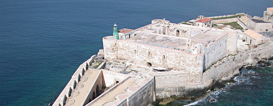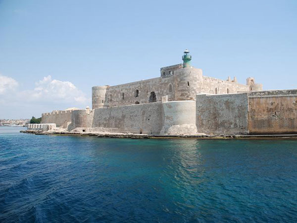 Il Castello Maniace particolare gioiello dell'architettura militare sveva, prende il nome dal generale bizantino Maniace che aveva occupato Siracusa nel 1038 liberandola dagli Arabi. Il castello è uno dei più importanti monumenti del periodo svevo a Siracusa e tra i più belli castelli federiciani. Esso sorge sulla punta estrema di Ortigia per controllare il porto e la città di Siracusa. L'impianto originario del castello Maniace è dovuto all'imperatore Federico II di Svevia, che lo fece erigere tra il 1232 e il 1239, seguendo le regole della razionalità e simmentria, dall'architetto Riccardo da Lentini, a pianta quadrata. Il castello aveva una doppia veste difensiva. Il castello è a pianta quadrata con lati di 58 metri, è impostato su un basamento a scarpa e agli angoli ospita quattro torri angolari cilindriche. All'interno vi sono i resti di unico e grandioso salone, la sala ipostila, che era completata da 25 eleganti crociere, di cui ne rimangono 10 facenti parte delle due navate superstiti. All'interno l'ambiente doveva apparire come un'unica sala scandita da 16 colonne libere, 4 semicolonne angolari e 16 semicolonne perimetrali, che sorreggevano 25 camopate, coperte da volte a crociera costolonate. Quattro monumentali segnavano gli angoli delle pareti. I capitelli della grande sala sono di tipo fogliato con terminazioni uncinate, i "crochets". Nella maggior parte riproducono le foglie di varie specie vegetali e rappresentano la parte più importante del capitello. Alcuni capitelli sono "figurati" con le particolarissime foglie di palma con datteri che si aprivano lasciando spazio a piccole e delicate sculture. Un bellissimo portale strombato a struttura ogivale, realizzato con preziosi marmi policromi di varia provenienza e una seria di collonnine marmoree e capitelli decorati a figure zoomorfe. Sopra l'arco domina lo stemma spagnolo, che fu posto nel 1614. Ai lati del portale vi sono le due nicchie, destinate a contenere, su mensole aggettanti, i due arieti di bronzo. Tutto il Castello è cinto da fortificazioni e per accedervi occorre attraversare un ponte di pietra fatto costruire da Carlo V nel XVI secolo. Il complesso attuale è l'unione di tre blocchi diversi: il castello svevo, il bastione della Vignazza e il cortile di collegamento con la città.